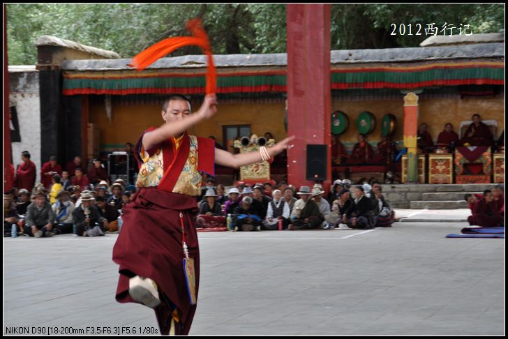 前排坐的是扎寺的大活佛们 不时,演出开始,场上鼓钹、法号齐鸣,各喇嘛、妖魔和护法神绕场一周,展示各种佛法形象,然后开始表演各种舞蹈。